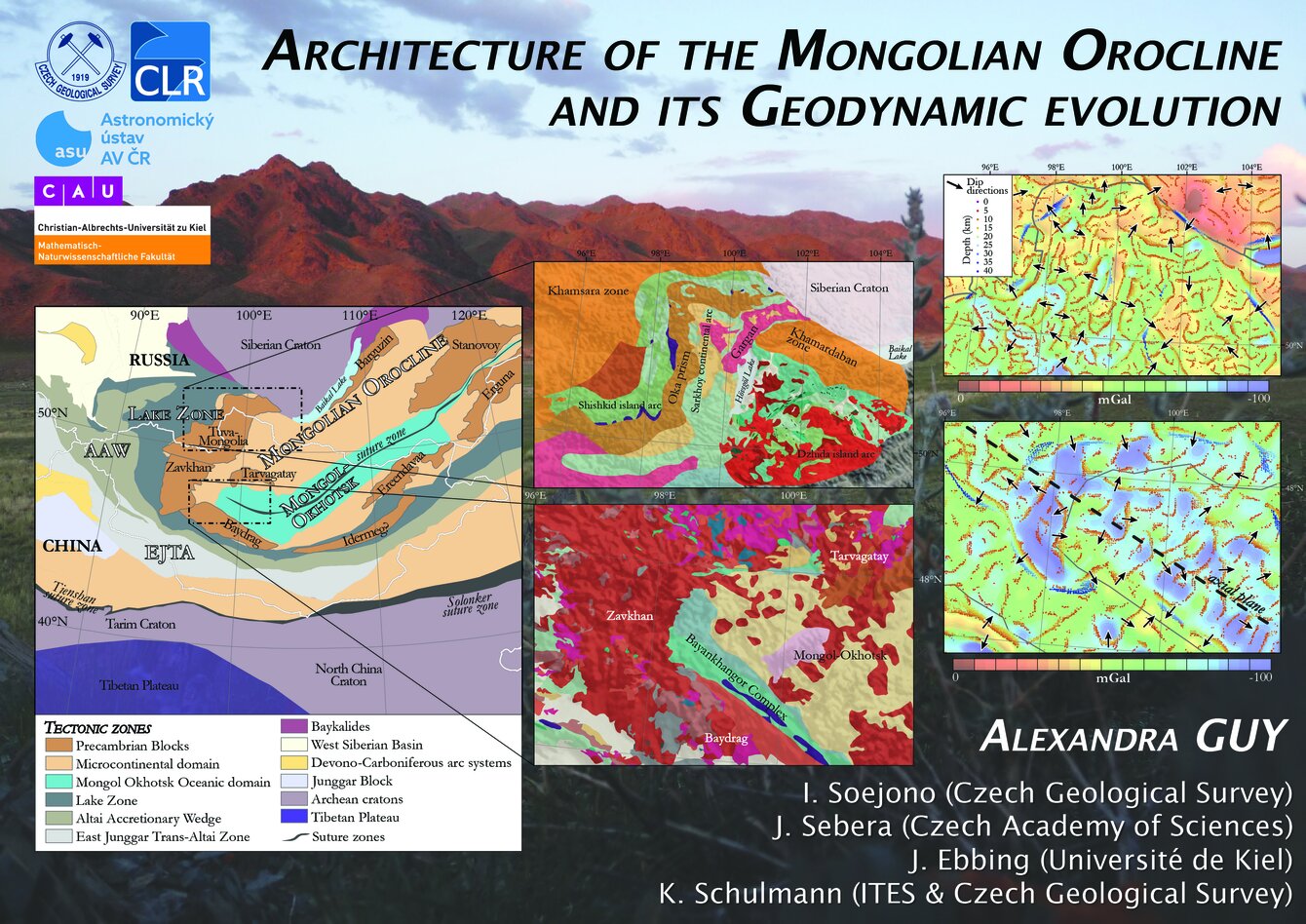 Contrary to previous models proposing multiple sutures separating the Precambrian microcontinents, our combined geological and geophysical evidence reveals no clear suture-related signatures between these blocks. Instead, they appear to form a single continental domain that underwent subsequent bending. The spatial distribution of high-pressure metamorphic rocks and arc-related magmatic complexes outlines two external continental scale sutures (the Mongol–West Sayan and Baikal–Sayan sutures) located along the orocline’s outer margins, and one internal suture zone along the northern boundary of the Mongol-Okhotsk domain. These observations support a model in which a near-linear continental ribbon surrounding the Mongol-Okhotsk oceanic domain underwent large-scale lithospheric bending during the late Paleozoic–Mesozoic. This study therefore suggests that the Mongolian Orocline represents the lithospheric-scale curvature of a formerly continuous continental ribbon rather than an assembly of independent microcontinents separated by multiple sutures.
