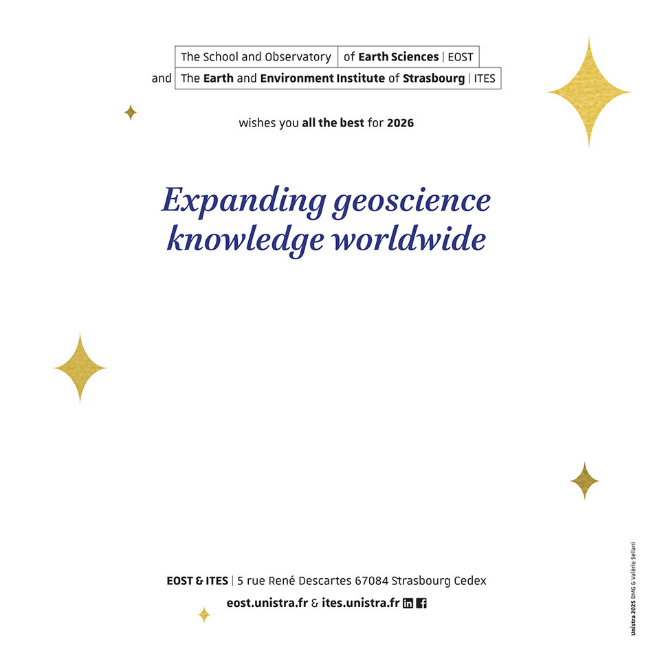 L’École et Observatoire des Sciences de la Terre, l'Institut Terre et environnement de Strasbourg, nos Instituts thématiques interdisciplinaires GeoT et Switch, nos Observatoires, nos Musées, vous présentent leurs Meilleurs Voeux pour la nouvelle année 2026.