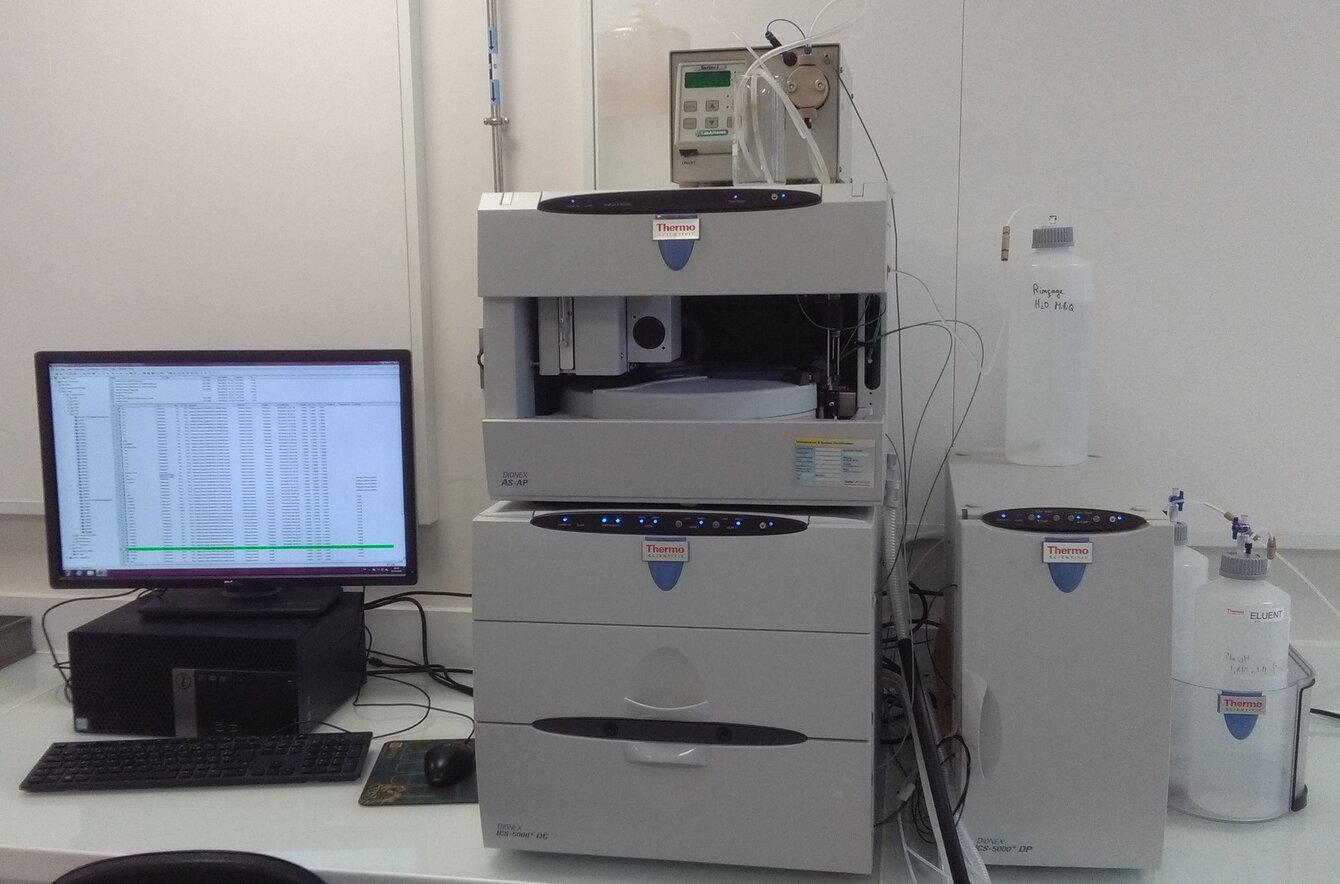 • Chromatographie ionique ICS 5000 (Thermo Fisher©) équipée de deux lignes analytiques permettant la détermination des anions et des cations contenus dans un échantillon aqueux de façon simultanée. Les anions analysés sont F-, Cl-, Br-, NO3-, NO2-, SO42- et PO43-. Les cations analysés sont Li+, Na+, K+, Mg2+, Ca2+, NH4+.