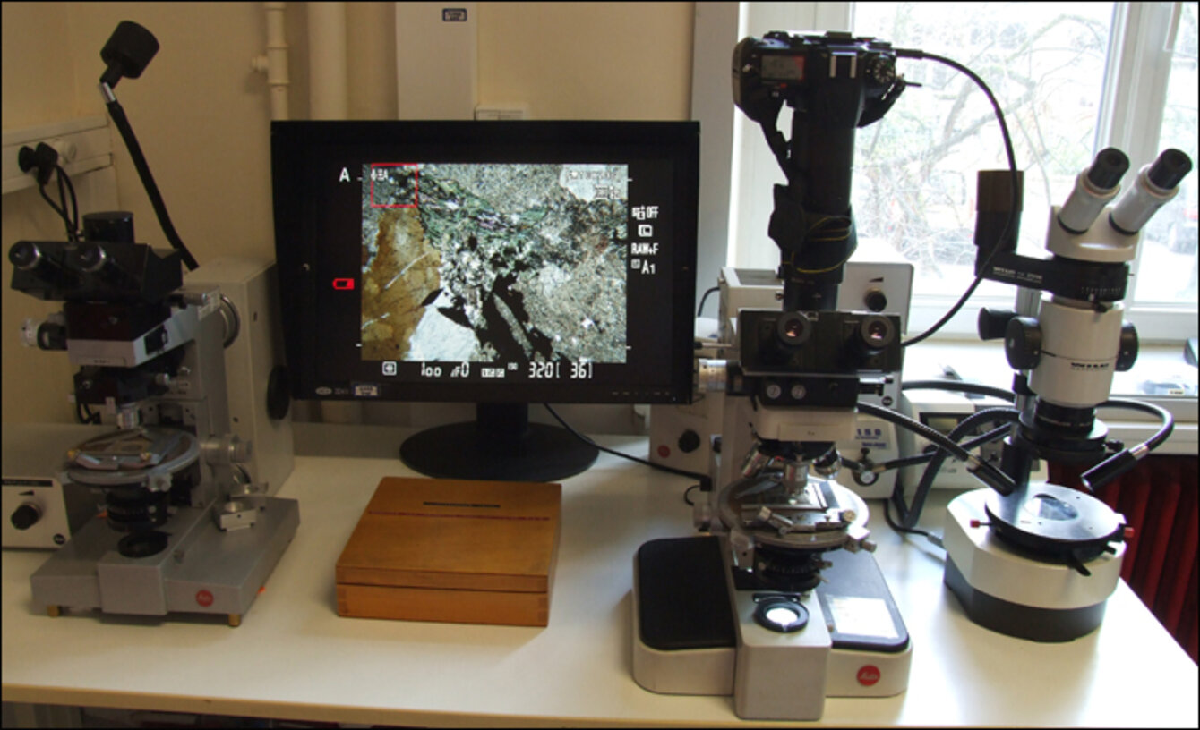 Microscope électronique à balayage TESCAN Véga 2 XMU (low vacuum), équipé d’un système de microanalyse X (EDS) et de diffraction des électrons rétrodiffusés (EBSD) EDAX PEGASUS. Porte-objets spécifiques pour lames minces et sections polies conçus au laboratoire.