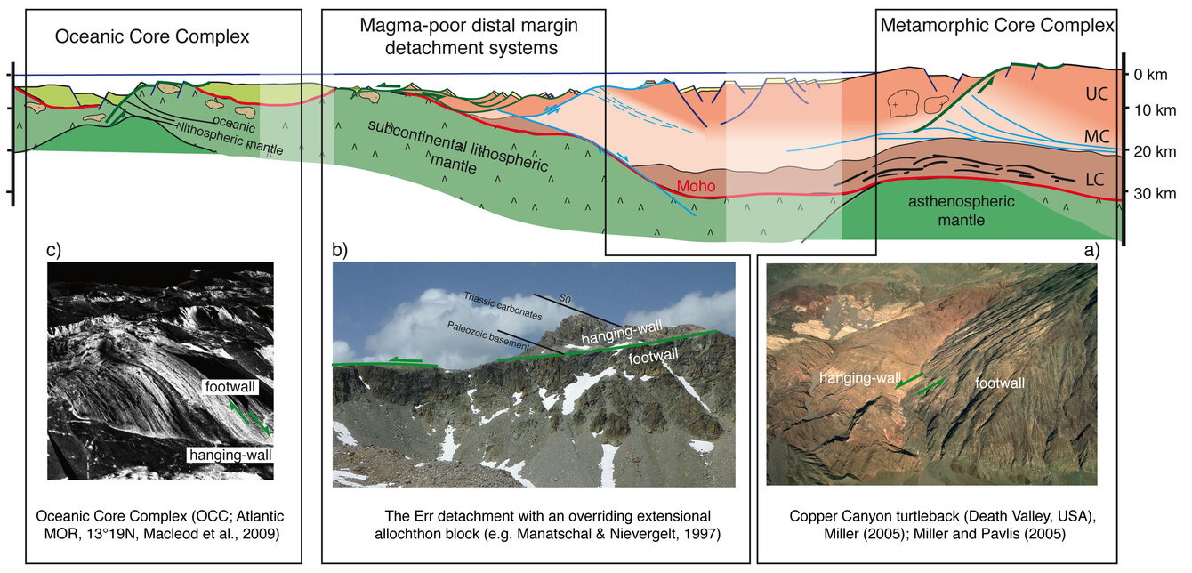Les objectifs et résultats des recherches sur les marges pauvres en magma qui représentent ~50% des marges mondiales consistent en la proposition de modèles de leur évolution d'abord conceptuels, puis numériques et dynamiques(Lavier& Manatschal 2006, Whitmarsh et al. 2001, Manatschal 2004). Ces modèles décrivent l'évolution de ces marges par trois modes de déformation: 1–l'étirement (stretching ; pure-shear), 2– l'amincissement (thinning) et 3–l'exhumation (exhumation ; simple shear). Ils ont également permis d'identifier un bloc tectonique, le bloc H, jouant un rôle particulièrement important au cours de l'évolution (Sutra & Manatschal 2011). Les modèles sont contraints par l'interprétation de données de sismique réflexion/réfraction et des forages ODP dans les marges Ibérie-Terre-Neuve et Atlantique sud (Péron-Pinvidic & Manatschal 2010, Unternehr et al. 2010), ainsi que par des données de terrain des reliques de la marge téthysienne fossile dans les Alpes (Mohn et al. 2010, Masini et al. 2011).